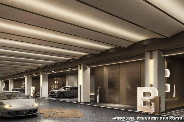 精装车库,金茂这次也拿出了流光穹顶的天幕和定制化的归家门头,甚至地面都采用了石材来增加奢华感。