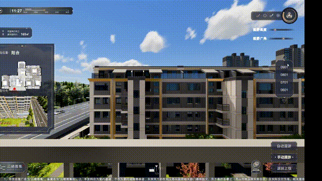 楼栋选房按照楼栋、单元、房号的逻辑进行选房。选择房号,点击进入室内,在阳台上、窗户边,一房多景,感受不同楼层的景观视野,给购房者提供选房决策,还可以自由漫游于室内。