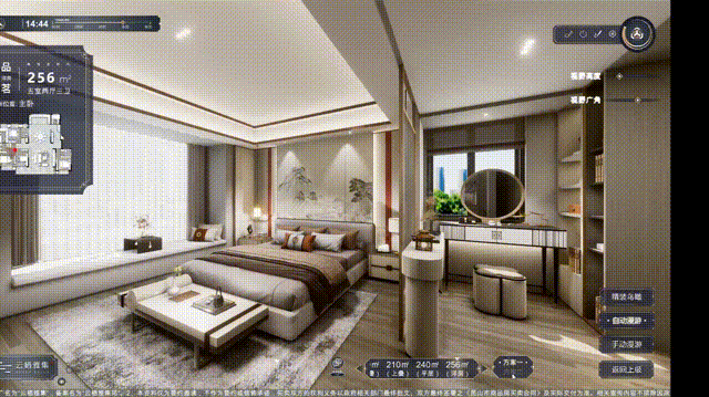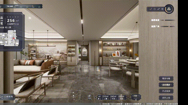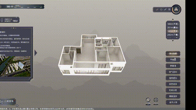 户型鉴赏中户型图下嵌入“精装鸟瞰展示”、“精装漫游展示”,精装鸟瞰和精装漫游可以相互切换,足见数字沙盘强大的后台功能。进入户型漫游,沉浸式漫游让使用者感同身受现场看房效果,就好像“住”在房子里。