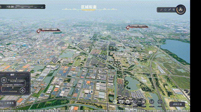 周边配套分交通、商业、教育、休闲、医疗五个方面,采用立体式图文UI进行展示,操作过程中未查看的UI实时隐藏,停止操控时全部即时显现,保证最大视觉空间而不耽误操作。