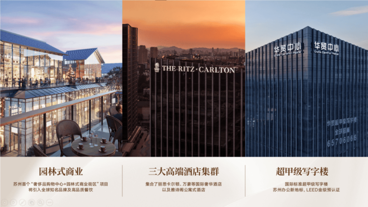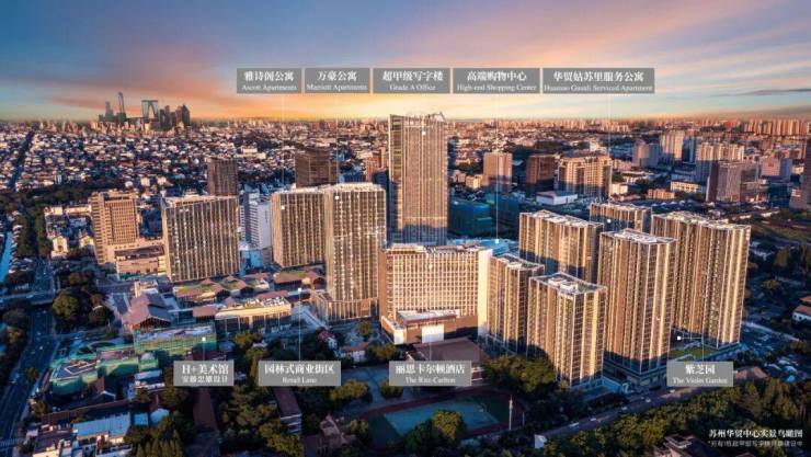 苏州华贸中心择址苏州姑苏区核芯,约78万方地铁上盖城市综合体,规划超甲级写字楼、精品购物中心、园林式商业街区、丽思卡尔顿酒店、万豪行政公寓、雅诗阁服务公寓、华贸姑苏里服务公寓、H+美术馆、紫芝园等多元业态,充分融合东方历史文化与大都市商业文明的精髓,致力于打造全新的江南大都会生活方式。