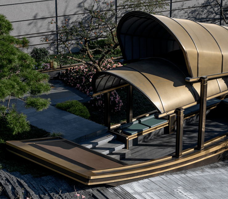 除“三进”所赋予的仪式感之外,整个展馆还融入了青浦本土水韵文化,营造出了“行舟六幕”的东方美景!移步异景,都蕴含着深厚的历史与人文内涵,把东方的建筑元素与现代居住环境相融合,使其富有魅力与实用性。