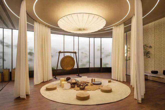 静安里为业主打造了约1000㎡的私属会所。走入地下,恒温泳池的水面泛着蓝光,旁边的瑜伽室铺着实木地板,还有一个高压氧舱,运动完能进去放松。