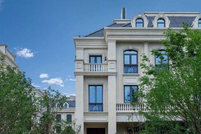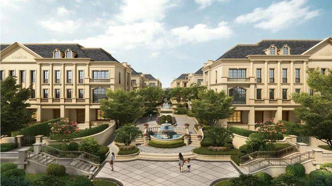 整个园区,以经典的绿城法式墅区景观大中轴贯穿,占地约1000多㎡,联排建筑的设计,融合了中国传统院落布局与法国枫丹白露宫的审美,外立面大面积采用全石材干挂,檐口等细节部位使用仿石。