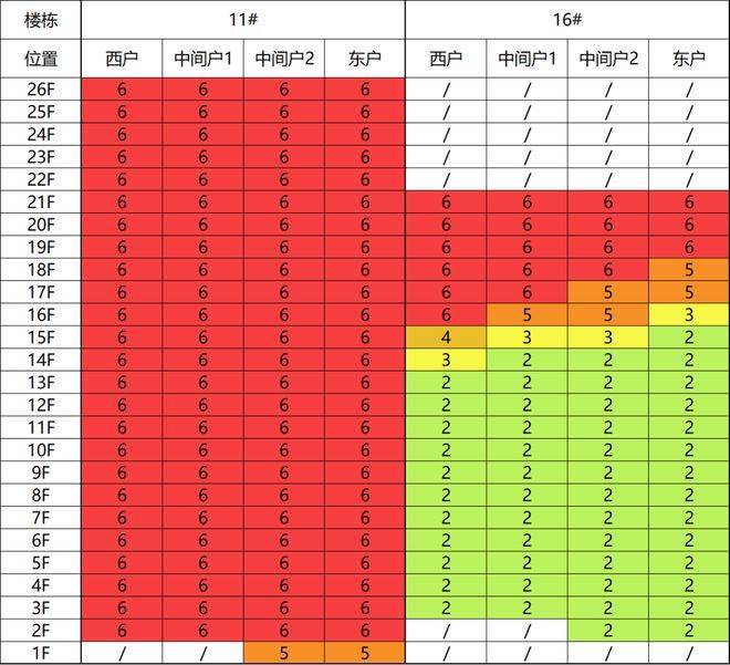 楼栋朝向正南采光优异。11#16#边户由于处于凹处位置,日照略有缺失。