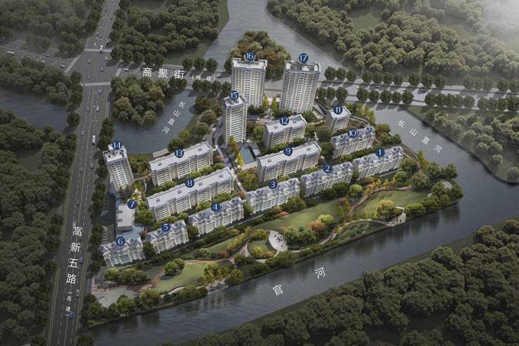 项目总体布局体现为“一环、两轴、三围合”的设计构思。一环”是指连接小区主次入口的主环道以及形成小区中央的大花园,“两轴”是指贯穿小区东西和南北两条相交的主要景观轴线,“三围合”是指小区南侧有50米城市绿化带,东侧和北侧均有20米城市绿化带,三面均被景观绿化带和东侧的长山直河、南侧的官河,北侧的郎家浜河所环绕,自然景观俱佳。