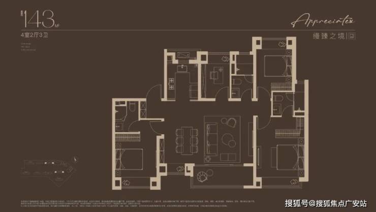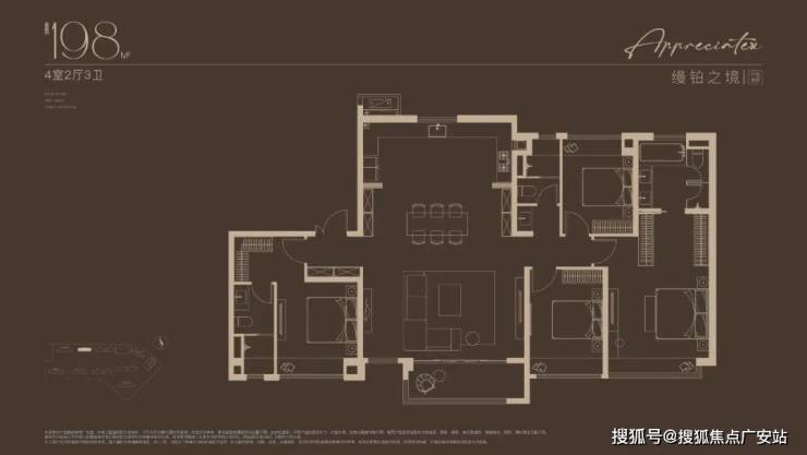 建面约143-198㎡四房三卫户型,2梯2户独立玄关设计,南向轩阔开间尺度(143户型约14米南向四开间,搭配约7米横厅;172户型约16米南向四开间,搭配约6米横厅;198户型约19米南向四开间,南北通厅设计,十字中轴洄游动线),揽四时风景入怀,东西双套房设计,奢阔尺度尽显家族气度,为高端改善和一步到位置业的优质选择。