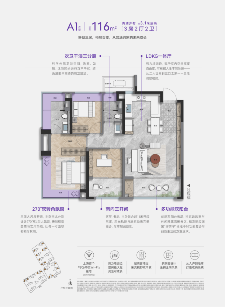 室内精装,除了采用方太厨具、德国高仪的龙头、德国唯宝的陶瓷洁具、科勒的卫浴这样的国内外一线大牌,更重磅打造上海首个华为坤灵Wi-Fi6智慧入户社区。