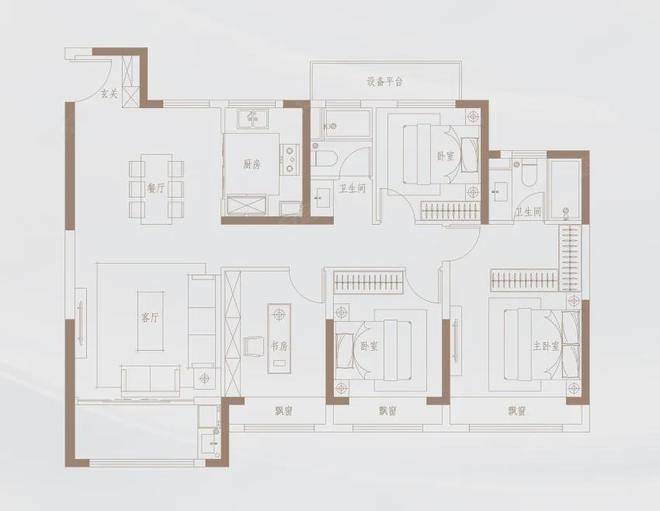 138㎡户型开间阔绰,4室2厅2卫,三房朝南,均赠送飘窗。