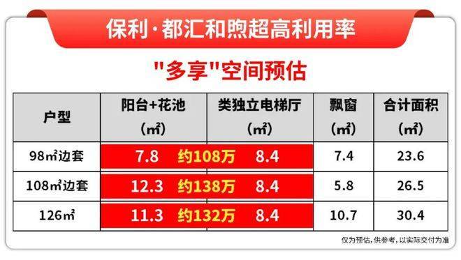 大致计算,98㎡双阳台+花池,可多享约7.8㎡, ✅✅保利都汇和煦售楼处电话:400-9016-520✅✅相当于送了约52万;108㎡三阳台+花池,可多享约12.3㎡,即约82万!