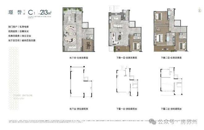 叠加——上叠 建面约198㎡、下叠 建面约213㎡;