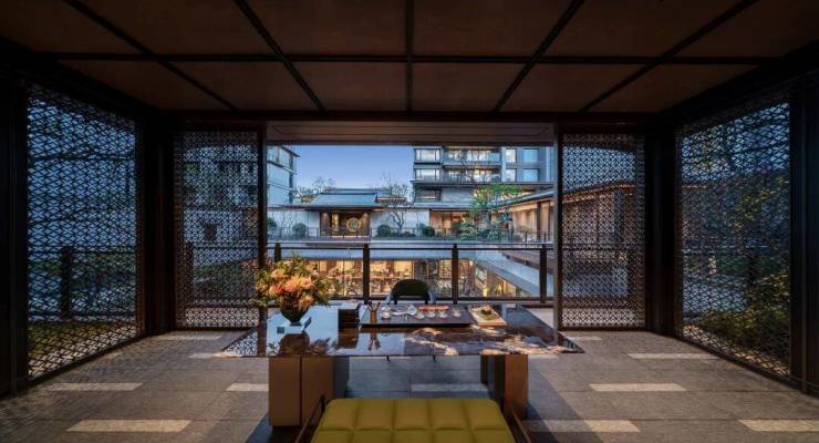 主背景雪山兰奢石,纹如凝山,静显稀贵。穿过大门就是二进迎客,借用柳岸闻莺的空间布局,还原“深柳叫黄鹂,清音入空翠”的西湖风光,同时还复刻花港观鱼的锦鲤池,营造临渊羡鱼的惬意场景。