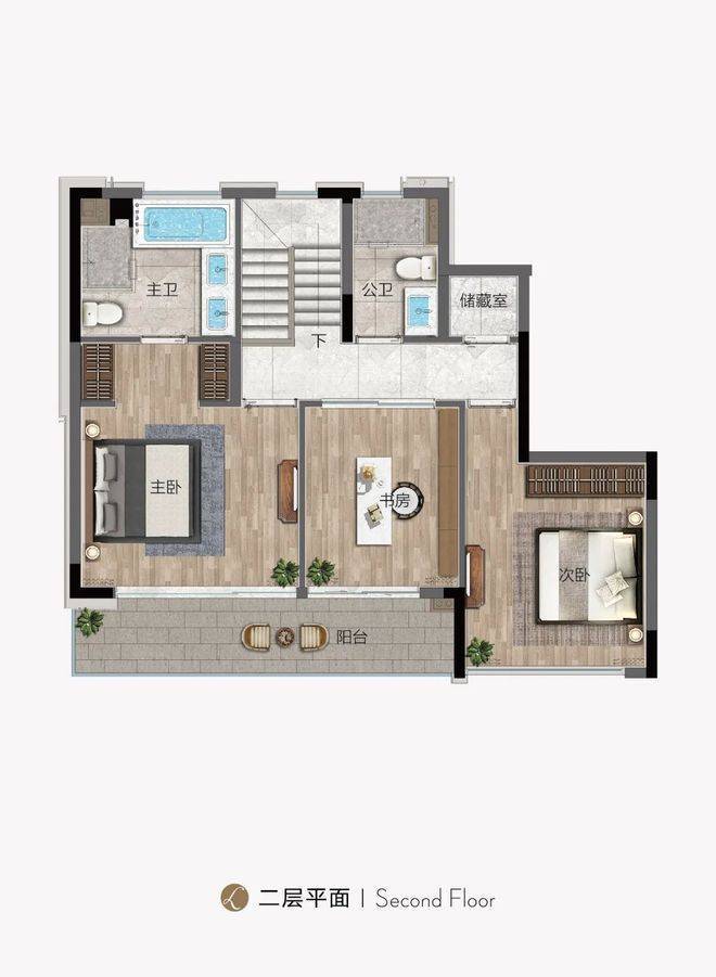 二层空间同样打造了约7.2米长阳台,二层设置了一个豪华套房主卧,以及一个次卧、一个书房以及公卫连通开间约4.2米的主卧与开放式书房,即使起居在二层,南向外接宽境阳台,可以眺望小区的园林美景。地下空间面积宽敞,可根据需求打造成专属的功能区:既可以作为放松身心的独处空间,也能改造成影音室、茶室,或是和亲友小聚的场所。它低调且独立,就像“第二客厅”,让居者既能享受户外生活的热闹,也能拥有独处或专属社交的私密场景。