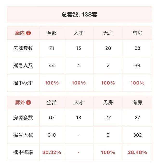 138套房源吸引了组家庭登记,其中人才4组,廊外有房家庭中签率最低,仅28.48%。
