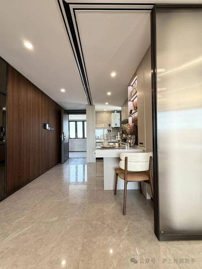 入户门设置玄关柜收纳体系,三段式设计,定制橱柜+石英石台面。
