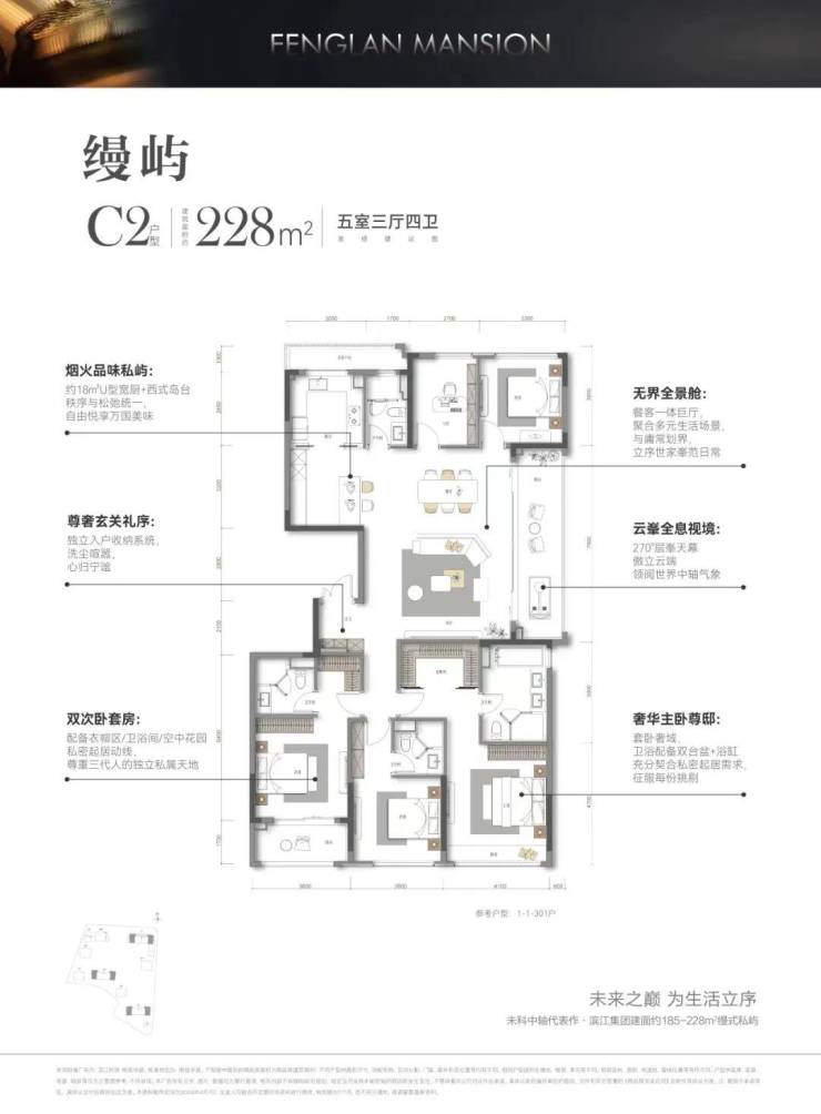 枫揽华庭也是,约185-228方的纯粹大户型设计,其中185-189方是大四房,建面约223、228方是五房: