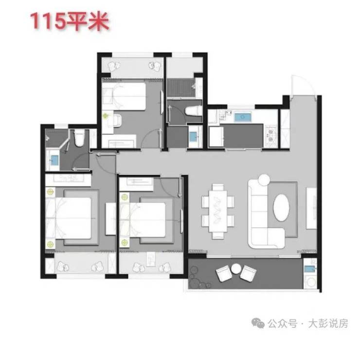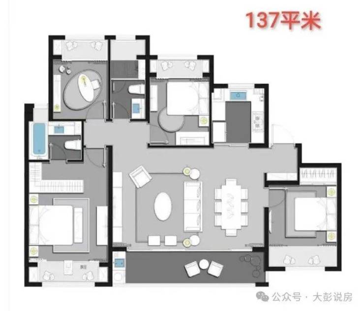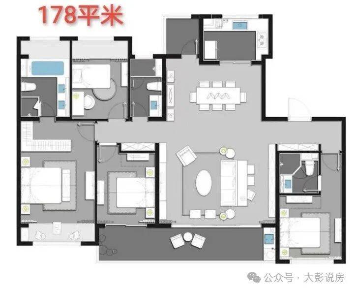 小高层178平米户型:终极改善绝版大平层,双套房三卫设计五开间朝南,9米南向三阳台;