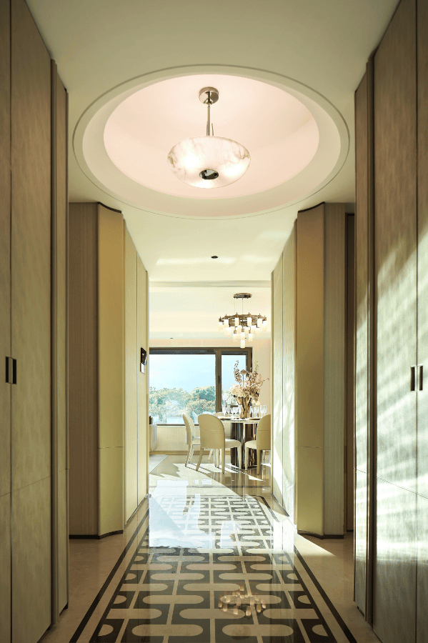 一路往里走,首层大堂与电梯厅均以梵高印象岩板装饰,营造出连贯而富有张力的现代艺术空间。