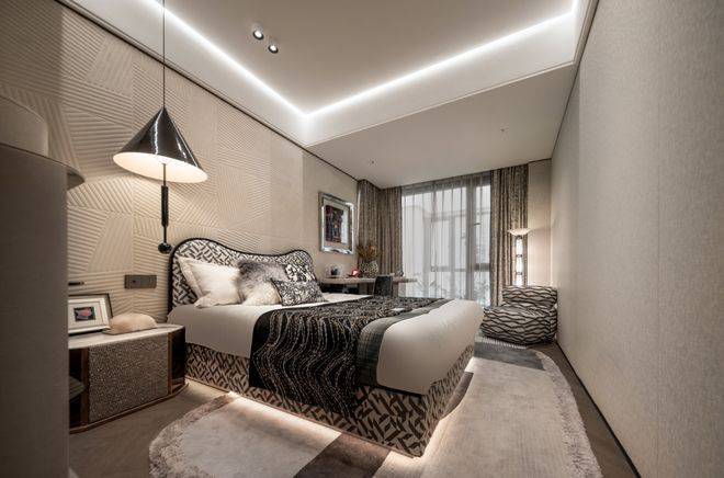 即便放了双人床、两个床头柜、一个收纳柜、两个休闲座椅和茶几,空间依旧绰绰有余,尺度感惊人!