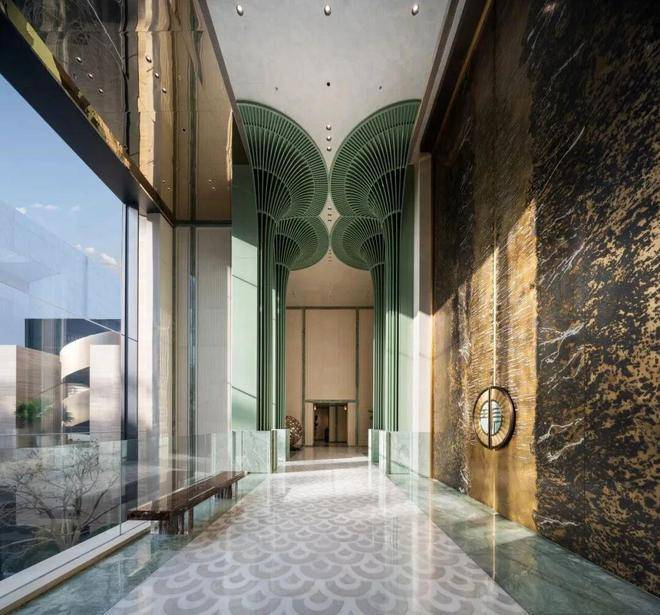 以杭州折扇为灵感而造的超尺度门庭,12片巴西进口百达翡绿玉石屏风,由非遗传承人朱炳仁团队打造的巨幅铜门,“玉镜流光”雕塑,大堂内八根巨幅立柱,还原了扇骨的形态,汝窑冰裂纹的陶片镶嵌,地面拼花运用江南花窗元素……