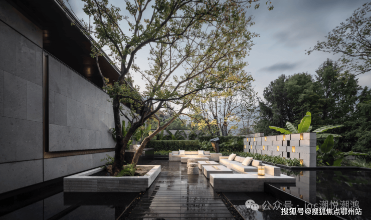 “高低落差”的特点从建筑形态延续到景观上,围合出约5000方的园林景观 以及约2500方的沿河景观,整体私密性较强且具备空间感,同时放大了景观的存在。行走在起伏的林荫道上,心情也跟着豁然开朗。