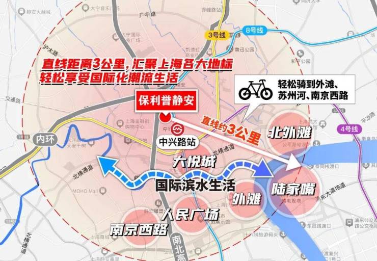 而项目到外滩和平饭店的直线距离正好是约3公里!妥妥的城心烫金地段!