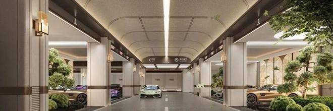入口约99米超尺度宏阔气象,取海派艺术大师吴湖帆《晓云碧嶂》中云岫初开的晨曦图,通过渐变晕染的山水长卷演绎青峰山林的诗意场景。奢石、名树点染其中,勾勒尊崇归家序幕。