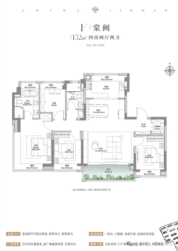 主卧带270°转角飘窗+卫生间,拥有寰宇级瞰景视野,让业主有更好的私密性和生活舒适度。