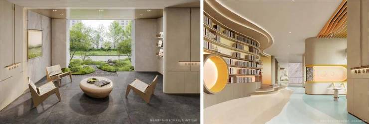 结合建筑、空间、自然环境关系,室内室外联动,呈现一个景观会客、海浪书屋、儿童休闲等多重功能的泛会所架空层,为全龄社交营造一个“有温度、有态度”的邻里空间。