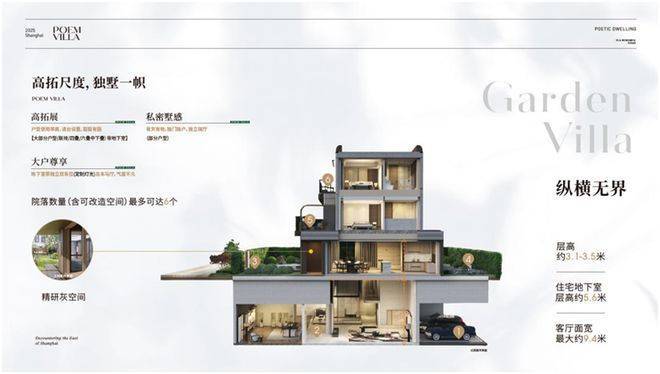 更以极致尺度打造舒居体验,地上层高约3.1-3.5米,地下室层高5.6米,部分户型客餐厅面宽达9.4米;家庭欢聚、圈层雅集皆可满足,让桃源生活有天有地。
