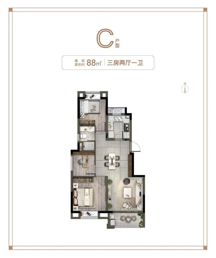 预算相对有限的,可以选这个建面约88㎡3房: