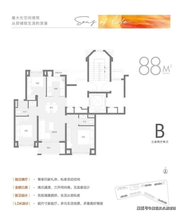 相较于市面上普遍的建面约88㎡只能做3房1卫的设计,该户型竟做到惊人的3房2卫!