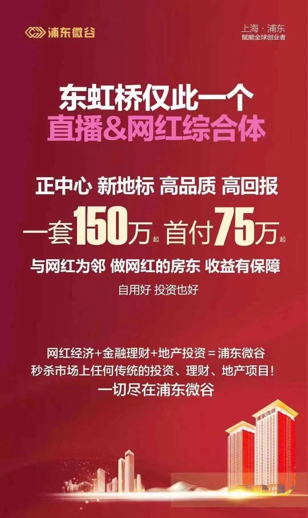 到浦东微谷,让你跟网红零距离。先给大家说一下这个网红公寓,总价在150万左右,精装全配。也许你买的房子,现在已经有网红入住了。现在租金是5000每月,随着网红收入加成,涨租是必然的。