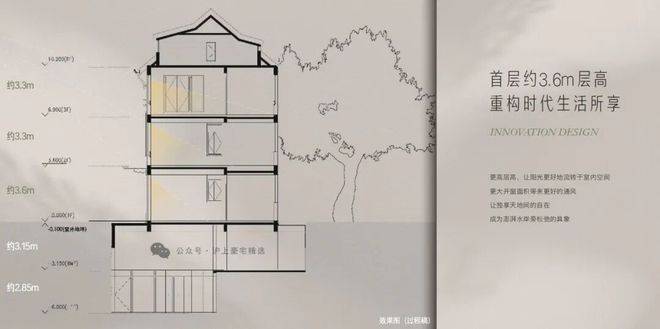 约3.6m首层层高,阔尺采光面。