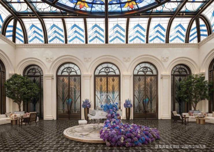 以玉兰门庭—迎归大堂—莳花荟为主轴,敬献步履生辉的归家艺旅:玉兰门庭如繁花盛绽,尊华瑞鳞水景聚运生财,双尊铜狮镇守家宅;迎归大堂流转光影艺韵,百羽栖澜艺术雕塑、芦海宸韵非遗绣作流淌摩登气韵;莳花荟中央会客厅移步异景,献映会客、休闲等雅会。