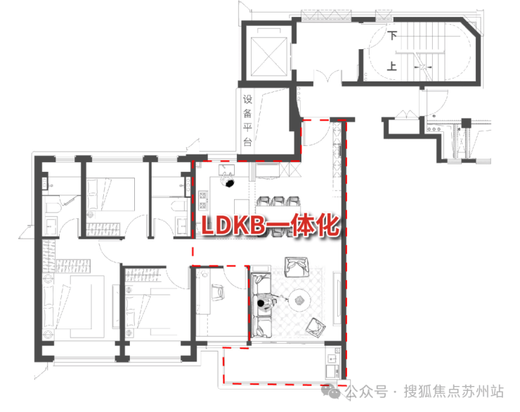 LDKB一体化的设计恰到好处的解决了面积不够的问题。厨房、餐厅、客厅三大空间联通,不仅通透感十足,还构建了一个利用率超高的家庭核心区,在这样高度开放的空间里,即使互不交流,也能保持交流和关注!