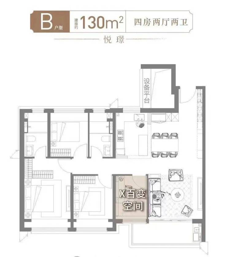 建面约130㎡四房两厅两卫