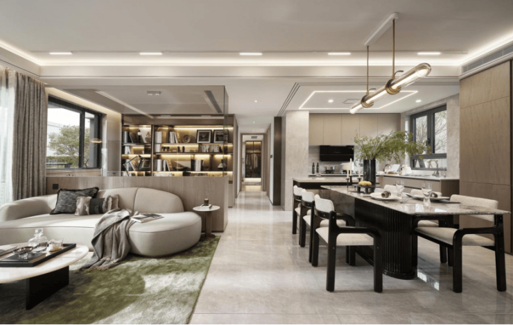 LDKB一体化的设计,将客餐厅、厨房融为一体,打破空间便捷的同时,尽可能地提升公区的空间使用率,尺度感超强,可轻松承载会客、家庭聚会、生日派对等场景。